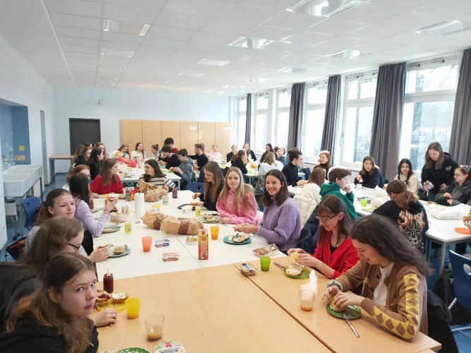 Teden smo na nemški gimnaziji otvorili s skupnim zajtrkom in zaključili s skupno večerjo, na katero je vsak prinesel domačo dobroto.