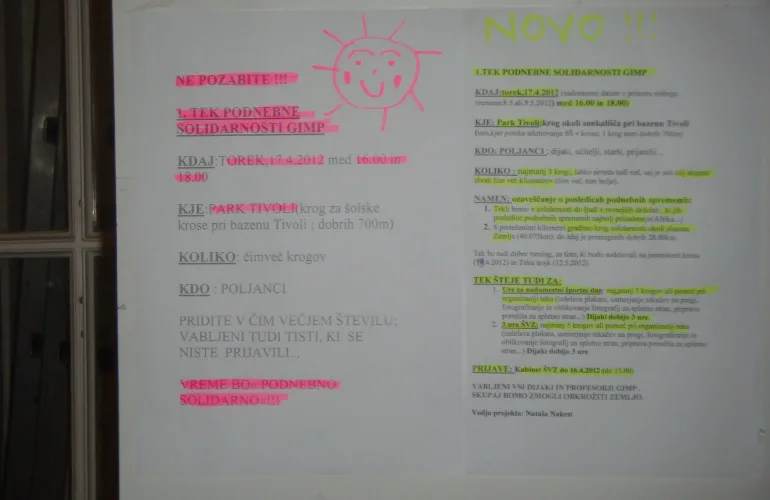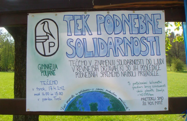 Glavni namen je bil ozaveščanje o posledicah podnebnih sprememb in nabiranje kilometrov za solidarnostni krog okoli Zemlje. Od marca do oktobra 2012 smo pri urah športne vzgoje in na raznih tekaških prireditvah tekli v solidarnosti do ljudi, ki jih podnebne spremembe najbolj prizadenejo, in tako našo celoletno tekaško dejavnost še bolj osmislili. V projektu je sodelovalo 900 poljancev. V tem obdobju smo skupaj zbrali 6211 km, kar je rekord med vsemi srednjimi šolami, ki so sodelovale. V okviru tega projekta smo organizirali tudi 1. Tek podnebne solidarnosti Gimnazije Poljane v Tivoliju (17. 4. 2012) in športni projektni dan za druge letnike, ki smo ga izvedli sodelovanju z geografi 5. 6. 2012. Več o tem odmevnem projektu si lahko preberete na tem linku.