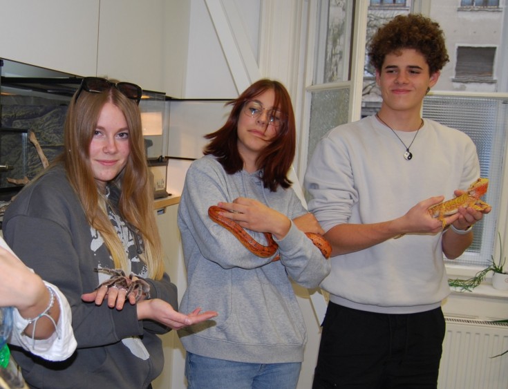 NIAN: Že od nekdaj so me fascinirale živali in rad sem poizvedoval o njih. Ko sem izvedel, da ima Gimnazija Poljane veliko živali, je bil to še eden izmed mnogih razlogov, zakaj sem se odločil za to šolo. K živalim sem začel redno hoditi v začetku drugega letnika - vsak glavni odmor. Name in na mnoge druge, živali delujejo pomirjujoče, zato je to del dneva, ko se razbremenim in odmislim šolske obveznosti. Izvemo veliko novih podatkov o živalih samih, pa tudi o tem, kako pravilno skrbeti zanje. Nastala je skupina ljudi, ki redno obiskuje vivarije in skrbi za živali. V njej se medgeneracijsko družimo, prav tako pa se pogovarjamo z učiteljicami biologije.